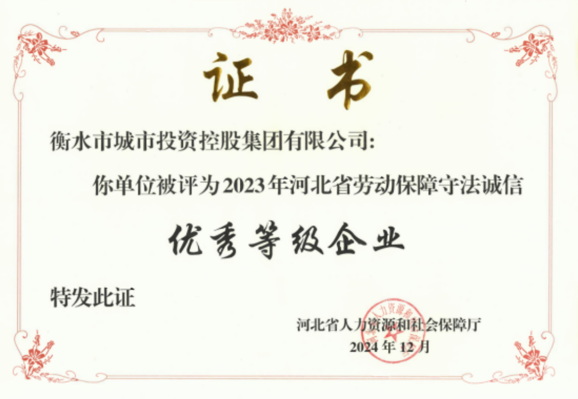 近日,河北省人力資源和社會保障廳印發文件,對河北省勞動保障守法優秀等級企業進行通報表彰,市城投集團榮獲2023年河北省勞動保障守法誠信優秀等級企業,是衡水市唯一獲此榮譽的市屬國有企業,也是我集團近幾年首次獲得的省級榮譽。